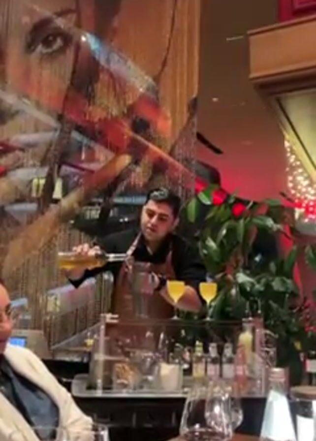 bartender preparing cocktails behind a portable bar in a restaurant. He is pouring a yellow liquid from a glass bottle into a cocktail shaker. There are two stemmed glasses with yellow liquid already prepared on the bar. Several bottles, ice, and other glassware are visible. In the foreground, there is a table set for a meal with wine glasses containing red wine and water bottles. In the background, the restaurant is decorated with plants, lighting, and a large decorative piece with what appears to be a woman's face. A woman is seated at the table in the lower left corner of the frame. The atmosphere is somewhat dimly lit.