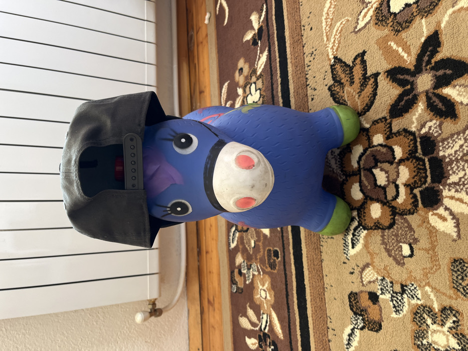 - "An inflatable blue pony-shaped toy, adorned with a backward-facing black snapback cap, stands centered on a patterned rug within an interior space in the city of Sheynovo, Bulgaria" by FM-yO5cv1, licensed under CC BY 4.0