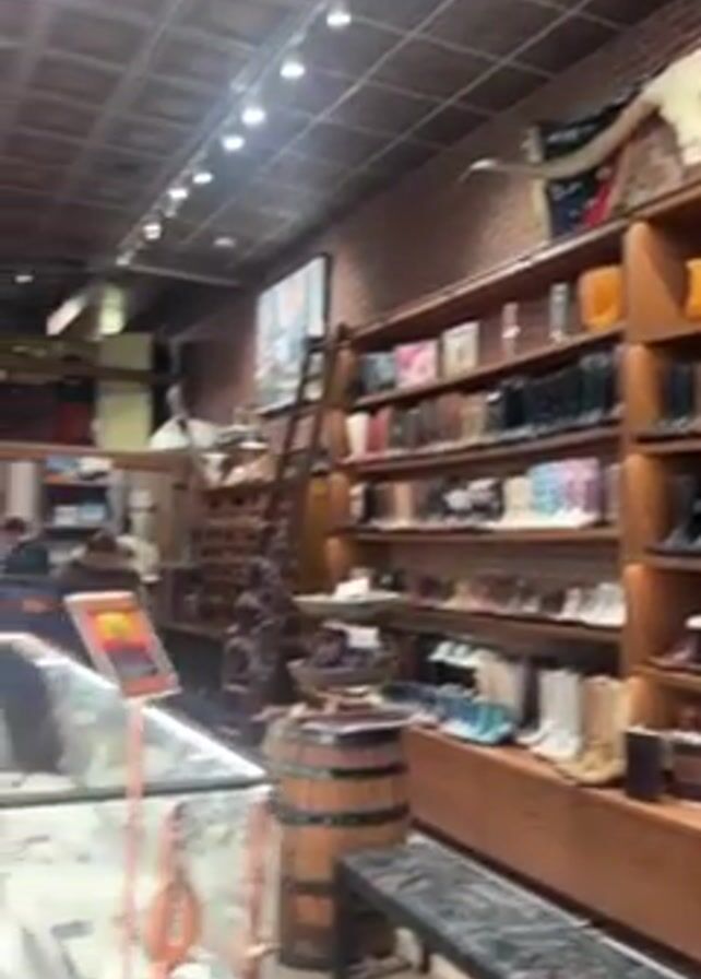 interior of a high-end clothing and accessories store. The store has a rustic decor, with exposed brick walls, a wooden ceiling, and vintage-style lighting. There are shelves filled with cowboy boots in various colors and styles, as well as clothing racks with jackets and other apparel. There are also display cases filled with jewelry. One person is visible in the video, walking around the store and browsing the merchandise. The overall impression is that the store specializes in Western-themed luxury goods.