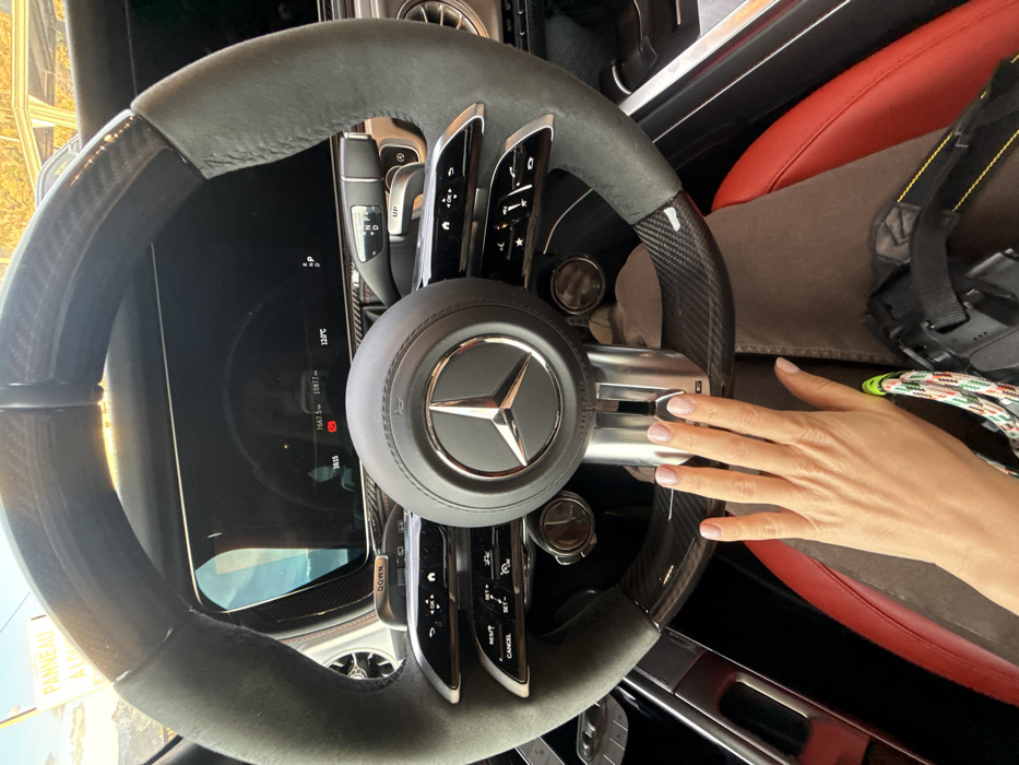 A close-up shows a car's steering wheel, predominantly black and silver, with a prominent Mercedes-Benz logo at its center. A hand with manicured nails rests on the wheel's right side. The wheel's construction includes carbon fiber elements. A digital display is visible behind the wheel, showing various metrics. Part of a red car seat and a black bag are visible in the background.