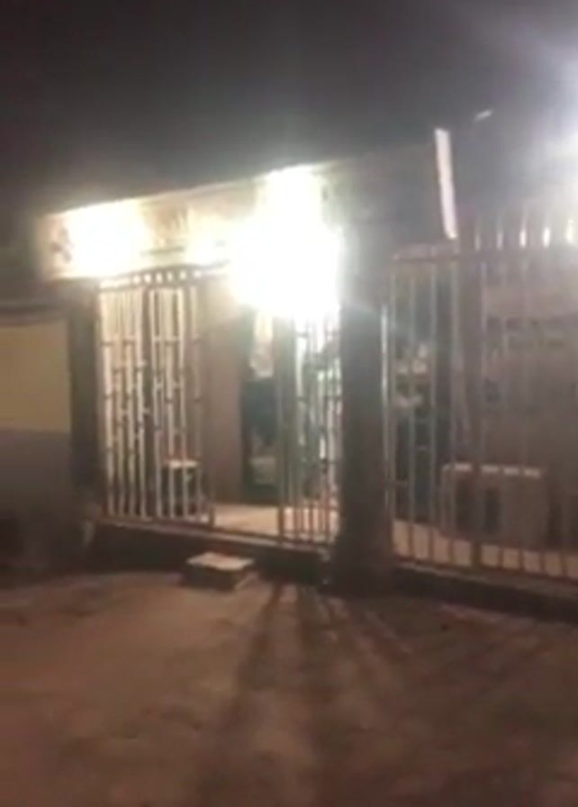 At night, an outdoor shot reveals a small, brightly lit building behind metal security gates. The building, possibly a shop or small business, has a sign above the entrance, although the text is not clearly readable. A small stool is visible just inside the gate. The foreground is a dark, dirt area, likely a road or path, with shadows cast by the gate and building. The overall scene has a utilitarian, functional feel, suggesting a modest commercial establishment in a simple setting.