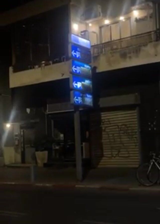 street scene at night. A tall sign with multiple blue, illuminated panels is the focal point. Each panel displays Hebrew text and an arrow pointing left, presumably indicating parking or directions. Behind the sign is a building with a balcony and a closed storefront with graffiti on the shutter. A bicycle is parked near the curb. The street is dark, lit by streetlights and the sign's illumination. There is no visible activity; the scene appears still and deserted.