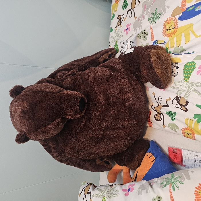 A large, brown teddy bear lies on a patterned bedsheet. The bedsheet features cartoon-style images of lions, monkeys, elephants, and palm trees. A blue and orange toy and some tags are near the bear. The bear's head is positioned towards a light blue wall. The bear is furry and appears to be a soft, plush toy.