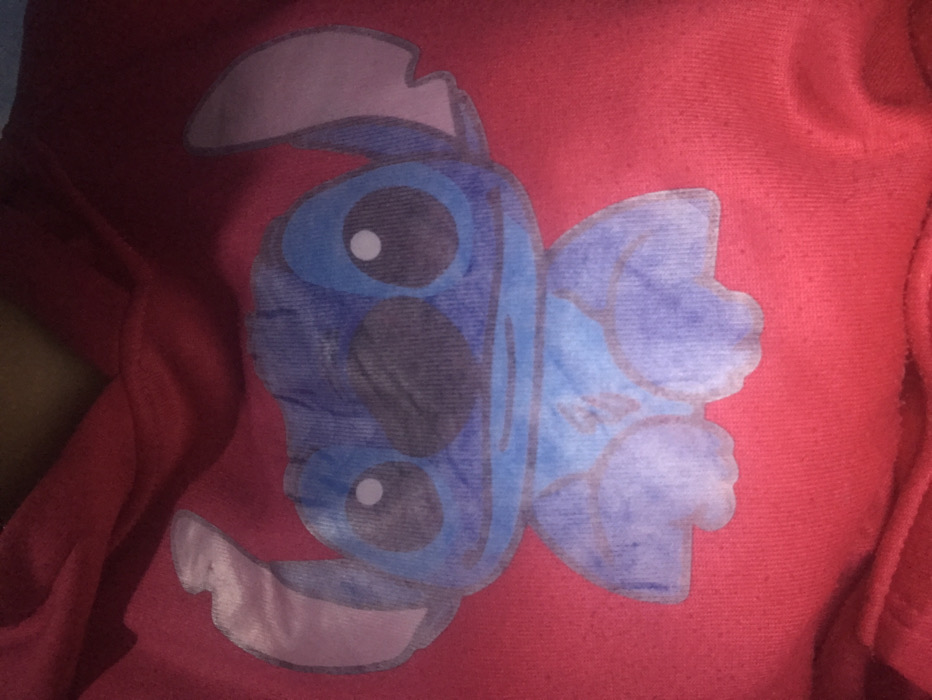 A close-up shot reveals a red fabric surface, possibly clothing. Dominating the composition is an image of Stitch, a character from the Disney film "Lilo & Stitch." The depiction is stylized, featuring a blend of blue and purple hues. Stitch's distinctive ears and facial features are clearly visible. The overall impression is casual, suggesting a garment adorned with a playful pop culture motif.
