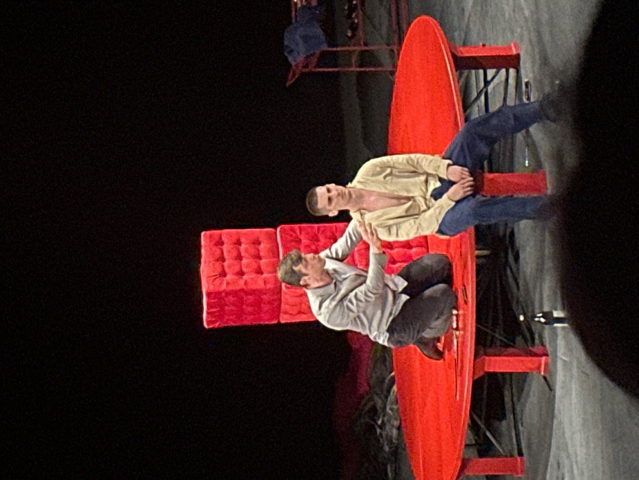 The scene depicts a theatrical performance on a stage in a theater in Sofia, Bulgaria. Two adult males are positioned on a set dominated by red props against a black background. One man, dressed in a light gray long-sleeved button-up shirt and dark trousers, kneels on his right knee on a large, round, bright red platform with multiple stout red support legs. His left hand is placed on the upper right arm of a second man. This second man, wearing an open tan long-sleeved shirt with the collar unbuttoned and blue jeans, is seated on the edge of the red platform, facing slightly away from the first man. He has very short dark hair and a neutral expression, looking forward and slightly down. His hands are in his lap. Behind the kneeling man, two square, tufted red upholstered blocks are stacked vertically. To the far right, a partial view of a minimalist red metal structure draped with a dark blue cloth is visible. A dark glass bottle rests upright on the dark gray stage floor beneath the red platform, near the viewer's foreground. The stage lighting illuminates the performers and props, creating a high contrast with the deep black, featureless background.