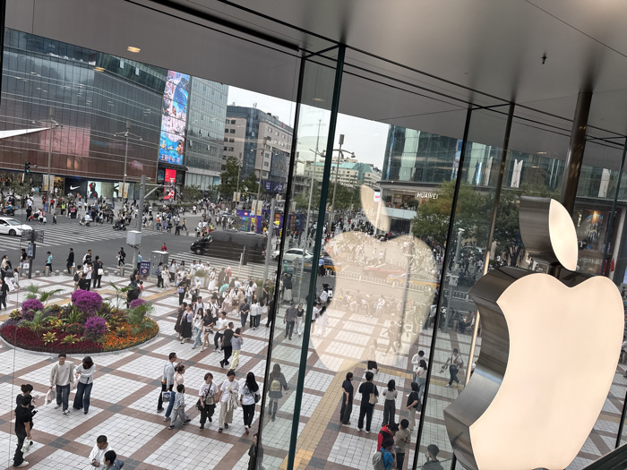 The image displays a bustling urban street scene in Dongcheng District, China, viewed through large glass panels from an elevated interior perspective. A prominent, illuminated, three-dimensional Apple logo, silver and white, is positioned in the right foreground, partially reflecting the exterior. Below, a wide pedestrian plaza features light-colored paver stones arranged in a grid pattern and a central circular landscaped island containing purple and yellow flowering plants along with green foliage. Numerous pedestrians, estimated to be well over one hundred, are observed walking in various directions across the plaza and on designated zebra crossings on the street. Vehicles, including a white sedan and a dark-colored van, are present on the multi-lane road, which is regulated by traffic lights. In the background, multiple multi-story commercial buildings with glass facades line the street. Notable commercial signage includes a large "Nike" logo on one building and a "Huawei" logo visible on a building further in the distance. Several large digital advertising screens displaying animated content are also integrated into the building facades. The sky is overcast.