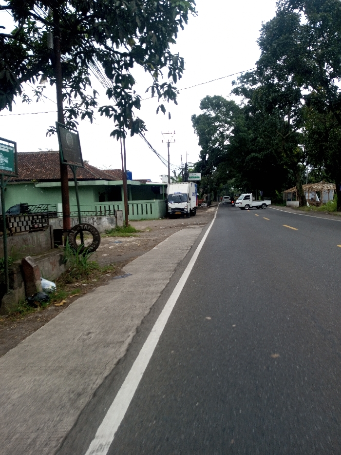 This image presents a wide-angle view of a roadside environment in Khajuripada, India, under an overcast sky. The foreground features a concrete sidewalk running parallel to an asphalt road, separated by a solid white line. Faded yellow dashed lines are visible on the road surface further down. To the left of the sidewalk, a dark-colored tire is vertically mounted on a stand amidst grass and sparse vegetation, with minor debris near a small concrete pillar. In the midground, a light green building with a reddish-brown tiled roof is partially visible behind a fence on the left. A white box-truck with "SAKANA" written in blue on its side is parked on an unpaved shoulder adjacent to the road, in front of a building displaying an "AJOHARA" sign. Multiple utility poles supporting overhead wires are also present on this side. On the asphalt road, a white pickup truck with an open bed is observed moving away from the viewer. A smaller vehicle, possibly a motorcycle, follows behind it. Further along the road, a dark-colored vehicle is visible. To the right side of the road, a rustic open-sided structure with a light-colored roof and wooden supports stands amidst dense green trees that line the roadside. No human subjects are discernible within the frame.