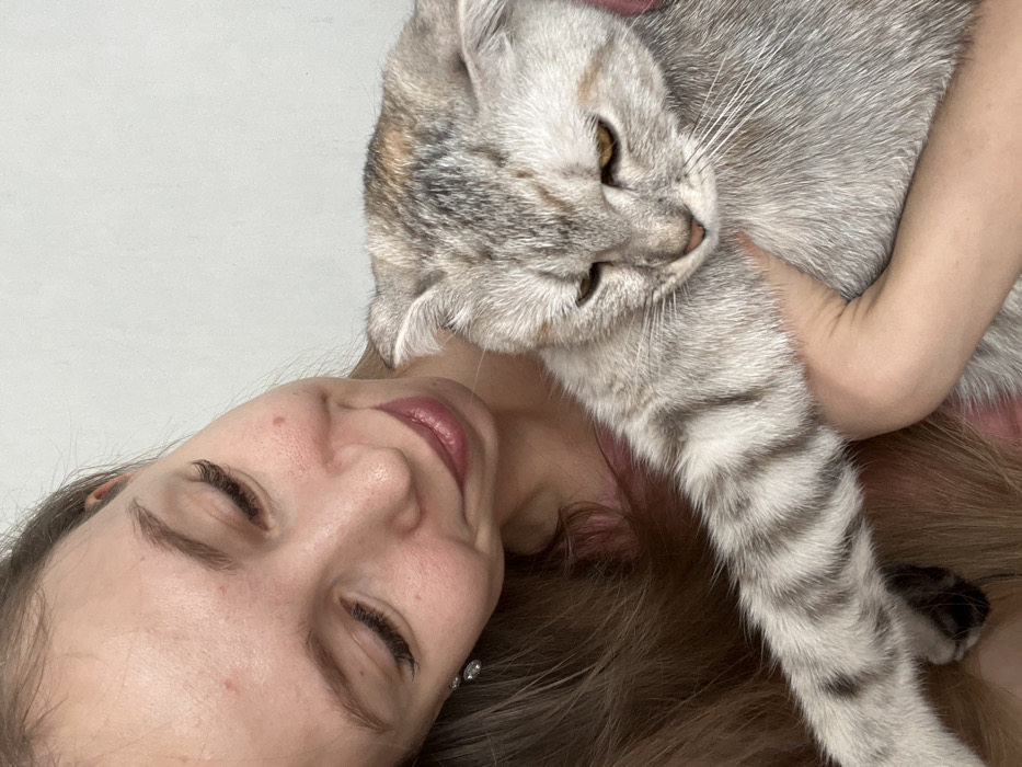 The image, captured indoors in Ludorvay, Russia, presents a female individual holding a domestic cat