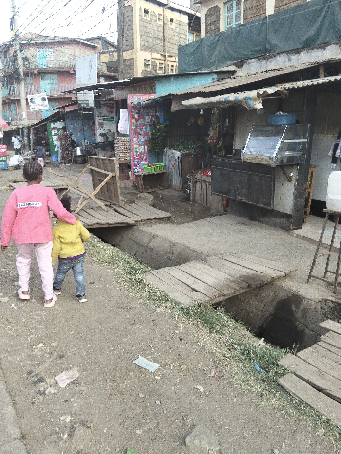 Two young girls walk across a wooden plank bridge over a trench, on an unpaved road. Surrounding them are informal shops and buildings in a densely populated urban area. A variety of goods are on display in the shops, including fruits, vegetables, and packaged items. The makeshift bridge is partially obstructed, suggesting a lack of maintenance or proper infrastructure. The scene reflects the everyday realities of life in a developing community.