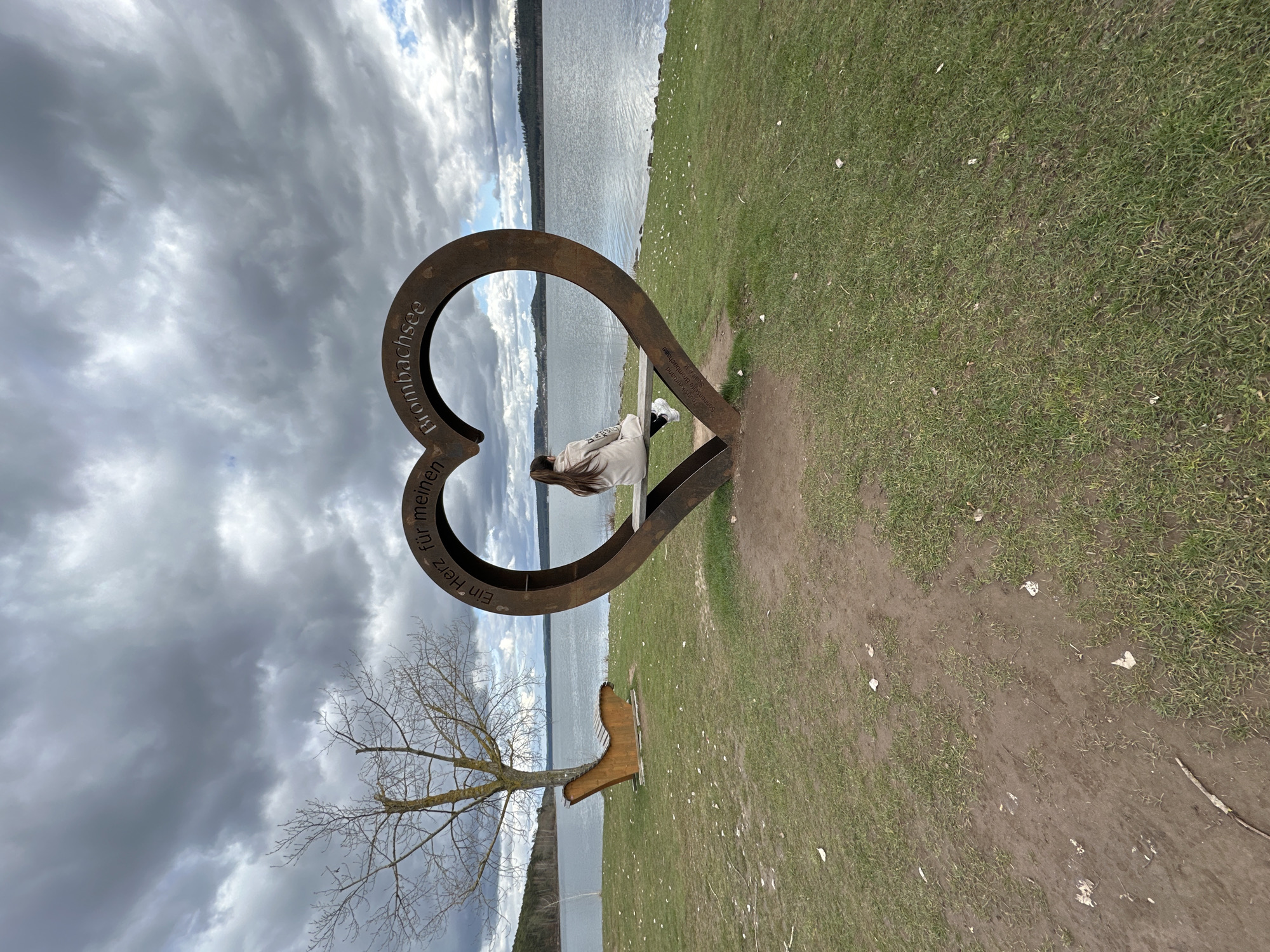 A woman is seated on a heart-shaped bench. The bench is located on a grassy area beside a lake, and is facing the lake. The heart shaped metal bench has German writing on it, which translates to "A heart for my Brombachsee". There is a bare tree between the bench and the lake. The sky is overcast with grey clouds. The location is Brombachsee, Spalt, Germany.