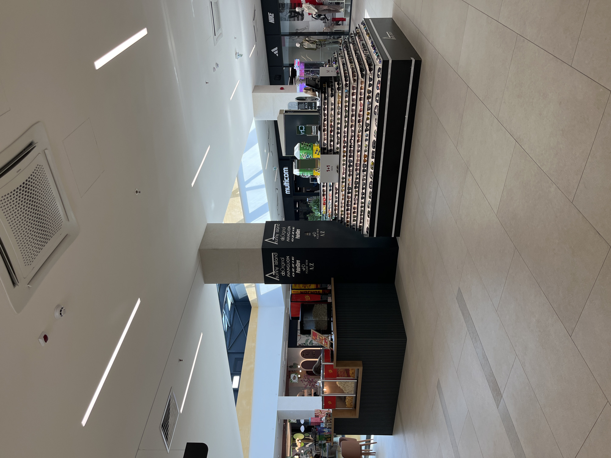 This image depicts the interior of a shopping mall, specifically identified as TQ Plaza in Budva, Montenegro. The scene is a brightly lit, modern commercial corridor devoid of visible individuals. In the mid-ground on the left, an L-shaped kiosk with dark paneling and a lighter countertop presents snacks. Three transparent dispensers contain popcorn and what appear to be chips. A red popcorn machine is partially visible behind the counter, which also displays various packaged candies and a menu board with red lettering. A single light-brown chair is positioned to the left of this kiosk. Dominating the center-right is a multi-tiered, pyramidal display unit for sunglasses. This unit is black with white accents, showcasing hundreds of sunglasses on its various levels. A sign on the display advertises "1+1 GRĀTIS" (1+1 Free). Adjacent to this display is a prominent black structural pillar listing eyewear brands in white text: "Sunny Island," "abOriginal," "AVANGLION," "OZZIE," "PolarGlare," and "A-Z." In the background, multiple retail storefronts are visible. To the right of the brand pillar, a "Multicom" store entrance is present. Further right, a "Nike" store is visible, featuring mannequins dressed in activewear, alongside a partially visible "Adidas" logo. Other retail spaces are discernible behind the snack kiosk on the left, one with arched decorative elements. The floor is covered in large, light-colored rectangular tiles, interspersed with darker accent strips. The white ceiling incorporates numerous linear LED light fixtures, recessed lighting, square air conditioning vents, and circular fire detection sensors. Natural light enters the mall through large skylights positioned above. No people are present, and no specific actions or interactions are occurring.