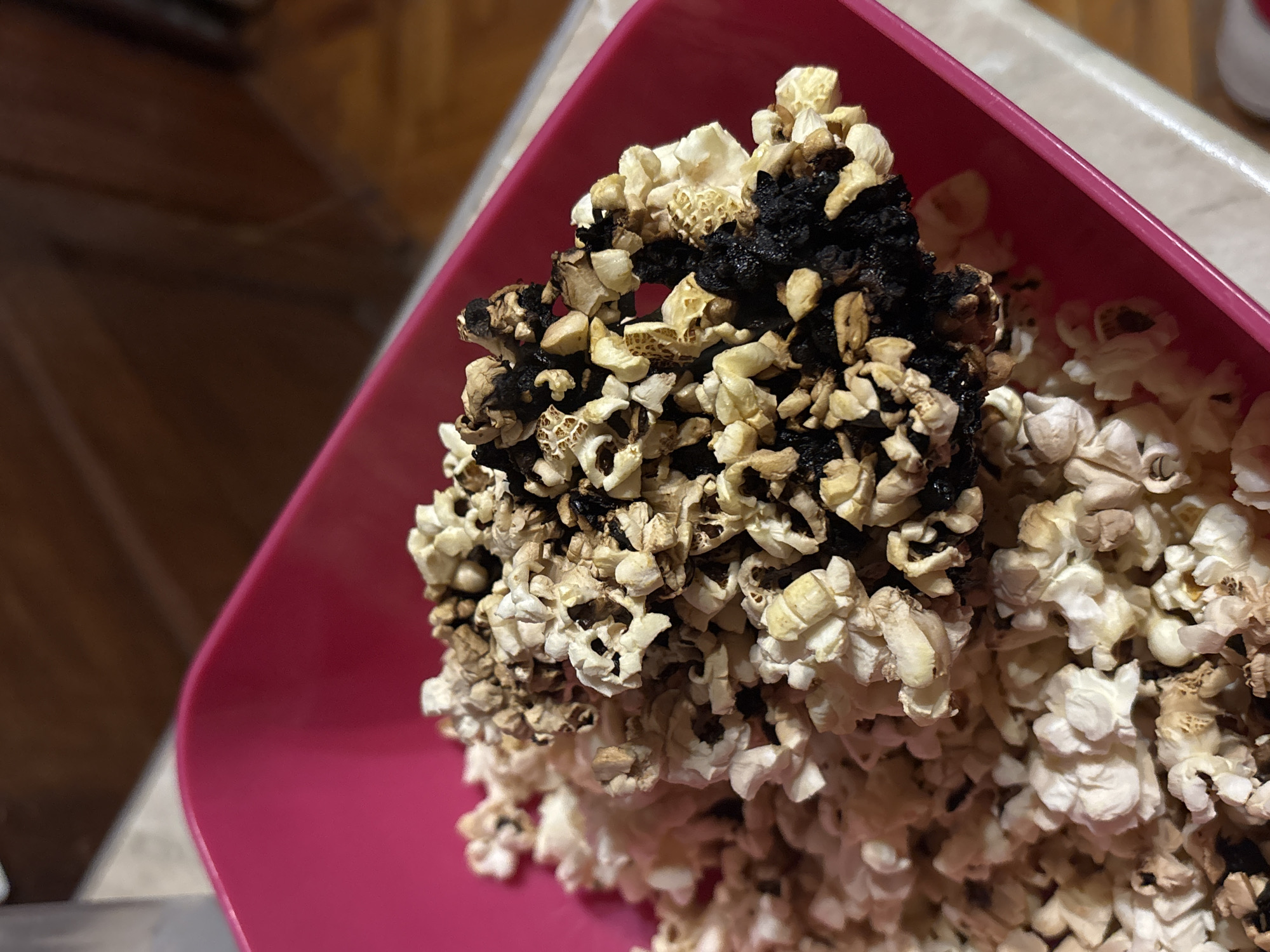pink square bowl filled with popcorn. A significant portion of the popcorn is burnt, appearing black and brown. The remaining popcorn is white or light tan. The bowl sits on a surface near a light brown wooden surface. The image was not taken in Varna, Bulgaria.