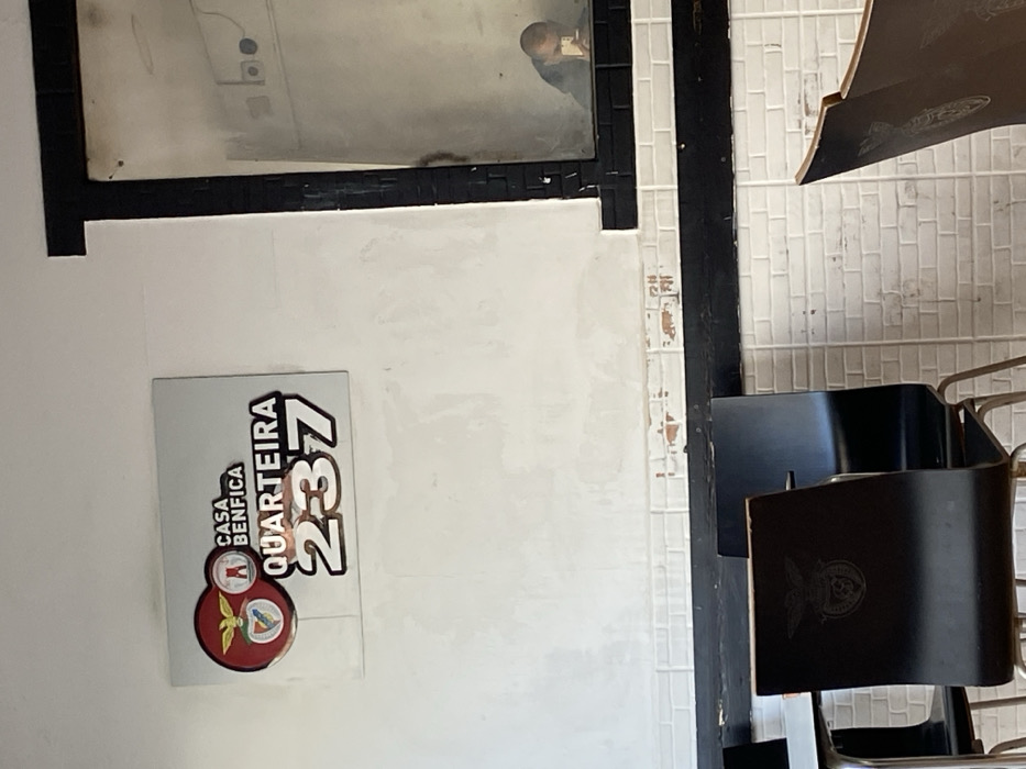 The image displays the interior of Casa Benfica 237, located in Quarteira, Portugal. The upper two-thirds of the wall are painted off-white, exhibiting some faint discolored patches. The lower third features white subway-style tiles, separated from the upper wall by a dark horizontal band. Another dark band runs along the top edge of the tiled section. A rectangular sign is mounted on the upper left wall, featuring the red, white, and gold S.L. Benfica club crest on the left. To its right, the text "CASA BENFICA QUARTEIRA 237" is displayed in raised, dark lettering with white outlines. In the upper right corner, a large rectangular mirror with a thick, dark frame is visible. The mirror reflects the partial image of a person with a bald head, holding a light-colored smartphone, seemingly capturing a photograph of the scene. In the foreground and lower left quadrant, the backs of several dark, possibly black or very dark brown, chairs with metal frames are arranged. At least one chair clearly displays an embossed or debossed S.L. Benfica club emblem on its backrest. A portion of a light-colored table is visible on the far left.