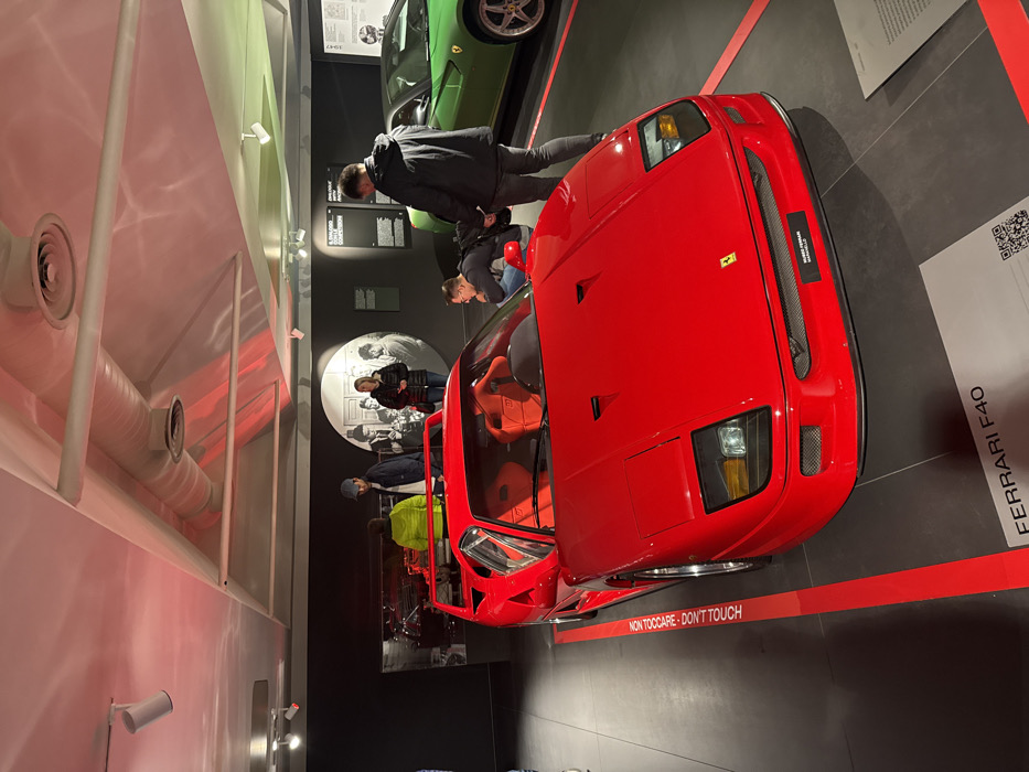 The image depicts the interior of the Museo Ferrari Maranello in Maranello, Italy. A bright red Ferrari F40 is centrally displayed on a dark grey floor, outlined by red tape bearing the instruction "NON TOCCARE - DON'T TOUCH." The F40 features visible red racing bucket seats through its open driver's window, and a small black plaque on its front grille identifies it as "MUSEO FERRARI MARANELLO." A large white floor sign in the foreground also labels it "FERRARI F40." Multiple individuals are present, observing the exhibits. To the right of the F40, a man in a dark jacket and trousers stands, looking towards a partially visible green Ferrari in the background. In front of the F40, another man in a dark top and glasses crouches, examining the vehicle closely. Further back, a person in a bright yellow-green hoodie views the F40's interior, alongside a man in a dark jacket and baseball cap. In the background, a group of visitors observes wall displays, including a large circular graphic featuring historical black-and-white photographs. The environment is characterized by dark walls and flooring, with overhead white pipes and ductwork. The ceiling is illuminated by spotlights and ambient red lighting, creating contrasting visual effects.