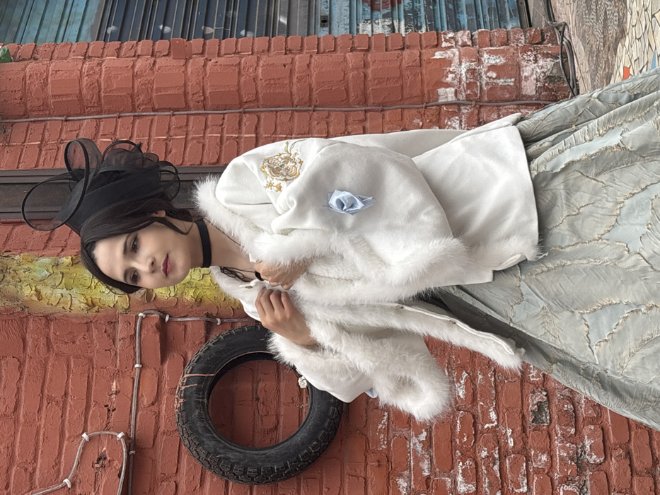 An outdoor, eye-level, three-quarter length shot in the city of Baqiao, China, depicts a female subject in an urban setting. The subject, positioned slightly right of center and facing left, has dark hair, a black mesh fascinator, and wears a black choker. Her hands are placed at chest level, holding the white faux fur collar of a white jacket. The jacket features golden floral embroidery on the right sleeve and a light blue ribbon bow on the left sleeve. She wears a textured, light blue and grey skirt. The background consists of a weathered red brick wall. On the left, a dark automobile tire is mounted on the wall, with white electrical conduits running above it. A vertical section of the wall to the right of the tire displays yellow and green textured paint. Further right, a portion of a corrugated metallic security shutter, possibly blue or grey, is partially visible. The ground below the shutter appears to be a mosaic pattern.