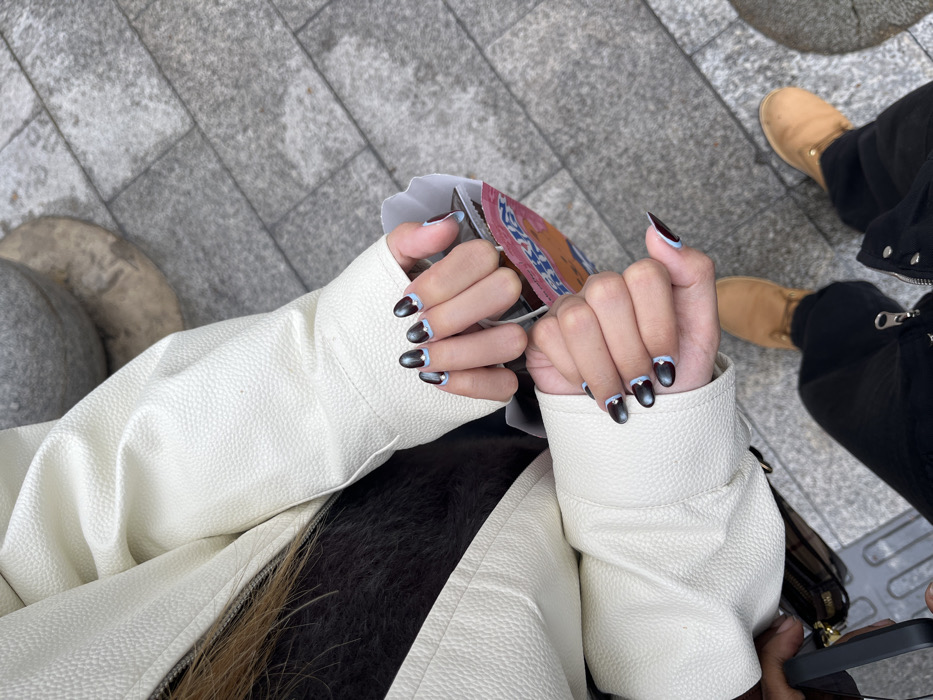 The image presents a top-down view of a person standing outdoors on a paved surface. The individual is wearing a cream-colored, textured jacket over a dark, possibly fuzzy, inner garment. Both hands are visible and display manicured nails. The nails are almond-shaped with a dark, possibly metallic, finish on the main body of the nail, complemented by a light blue crescent or wavy line design near the cuticle. Several nails feature a small clear rhinestone. The left hand holds a black-cased mobile phone and a partially visible small, patterned paper or plastic bag, which appears pink and orange with white handles. The person wears dark trousers with visible zipper details and light brown work-style boots. The ground is paved with light gray rectangular and square stone tiles. Out-of-focus gray stone elements are visible in the upper right background. There are no explicit visual cues within the image to confirm the specific location as Yuzhong District, China.