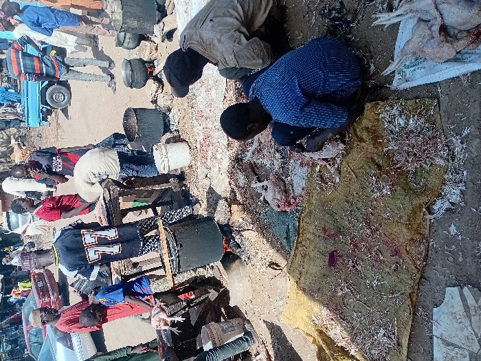 The image portrays an outdoor chicken processing operation within Sharada, Nigeria