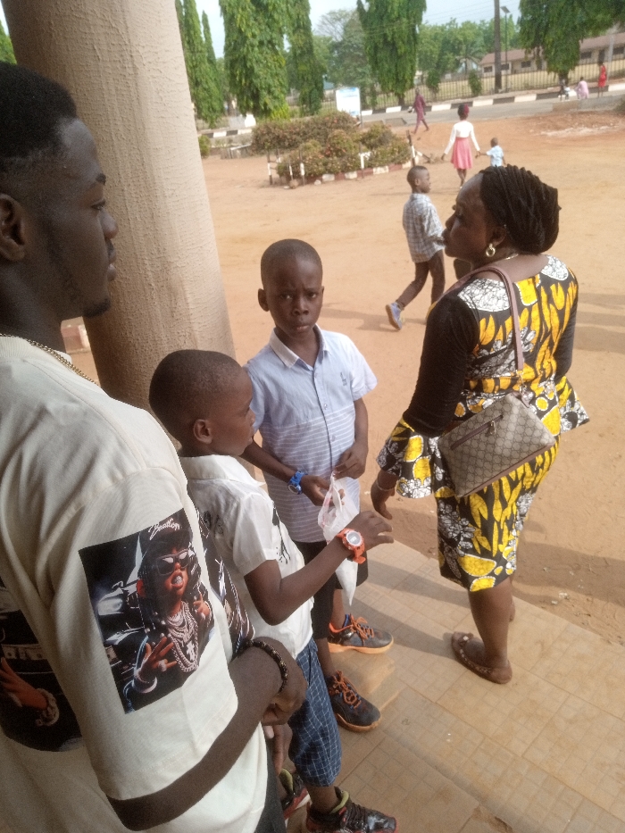 The image depicts an outdoor scene in Nsugbe, Nigeria, under natural light. In the foreground, partially visible on the left, is the right profile of a male individual with dark hair and a beard, wearing a light-colored t-shirt with a dark graphic print featuring a person wearing sunglasses and jewelry. Adjacent to him are two young boys. The boy closer to the viewer wears a white short-sleeved collared shirt, blue plaid shorts, and dark athletic shoes with orange soles; he holds his left arm up, displaying an orange-faced digital watch. The second boy wears a light blue horizontally striped short-sleeved button-up shirt and dark athletic shoes with orange soles; he holds a small, clear plastic bag with a white interior. To the right, with her back mostly to the camera, stands a female individual with dark hair styled in dreadlocks. She wears a yellow, black, and white patterned dress with long black sleeves and carries a tan crossbody bag with a recurring logo pattern. All four individuals are positioned on a light-colored paved surface. In the background, beyond an unpaved, sandy-brown area, several other individuals, including adults and children, are visible walking. Tall, slender green trees and shrubs line the distant background, with what appears to be a paved road or pathway beyond the sandy area.