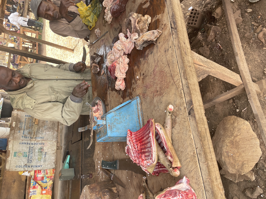 The image depicts an outdoor meat market stall in Barakin Lerawi, Nigeria