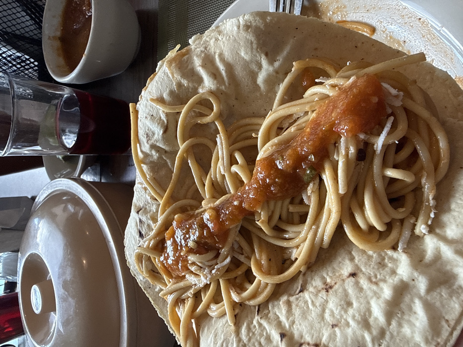 A close-up reveals a tortilla piled high with cooked spaghetti, generously topped with a chunky, orange-red sauce and a sprinkle of white cheese