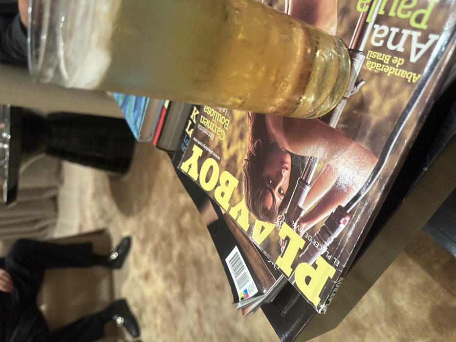 A full glass of light beer sits atop a stack of magazines on a table. The top magazine is Playboy, featuring a woman holding what appears to be a gun or rifle. The cover reads "EL PLACER DE VIVIR." "Carmen Boullosa" is printed on the spine, alongside "Ana Paula." A man in black pants and shiny black shoes is sitting in the lower left of the frame. A black lamp is also visible.