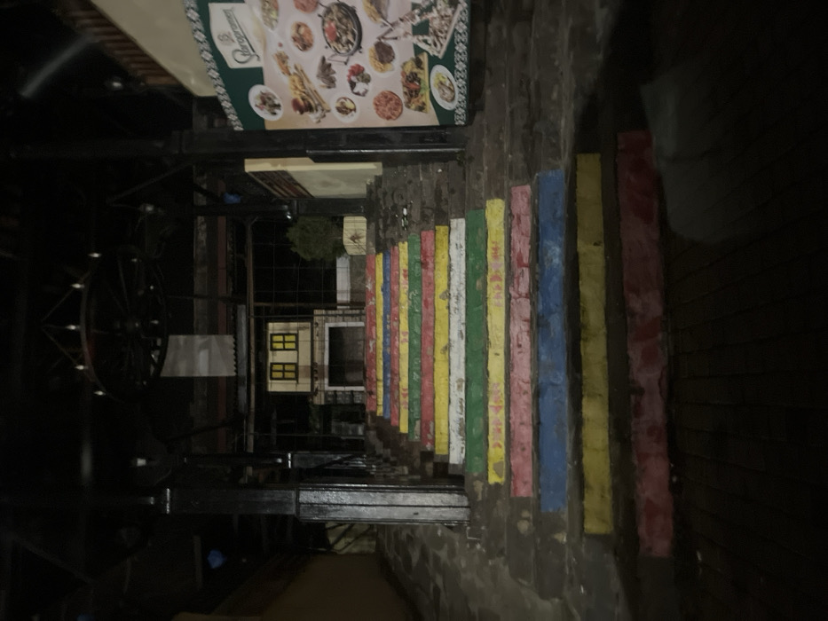 The image depicts a nighttime scene in Varna, Bulgaria, specifically the "Rainbow Stairs" leading to the "Starata Kushta" (Old House) restaurant. The central focus is a flight of approximately 14-16 stone steps ascending from the foreground towards the background. Each step riser is painted a distinct color, exhibiting wear and some fading. From bottom to top, visible colors include red, yellow, blue, pink, green, white, yellow, red, blue, green, yellow, red, blue, and a top-most faded red. At the top of the stairs, a small, decorative building facade resembling a traditional house with a dark roof and two yellow-framed windows is prominent. Below the windows is an open, arched alcove. Above this facade, a large, dark chandelier or light fixture resembling a wagon wheel hangs from an overhead structure. To the right of the house facade, a small potted evergreen plant is visible. To the immediate left of the colorful stairs, a darker, stone-paved ramp or pathway ascends, leading into a dimly lit, covered area supported by dark structural pillars. To the right of the colorful stairs, a large, illuminated vertical banner is affixed to an adjacent building wall. The banner displays various food items and features the "Staropramen" logo at its top. Darker, unpainted steps are also visible ascending to the right of the colorful stairs. The ground in the immediate foreground is dark and paved, possibly with stone or brick. No individuals or specific actions are visible within the scene.