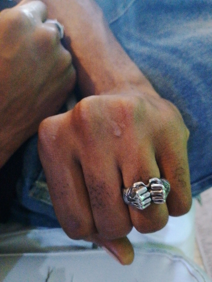 A close-up image shows a person's hands, one fisted and displaying a ring shaped like two clenched fists. The skin is tanned and slightly marked with what appears to be a small scar or healing wound. The wrist is partially visible, and a garment, possibly denim, is draped in the background. A second hand, also bearing a ring, is partially visible in the upper left corner of the image. The background appears blurry and includes a glimpse of a white surface.