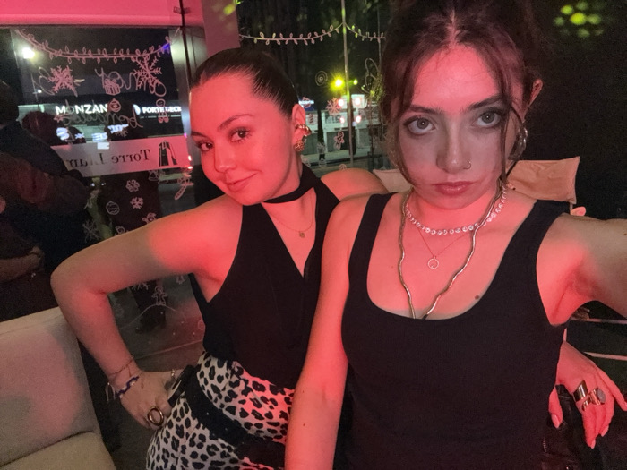 Two young women pose closely together in a dimly lit interior with red-toned lighting