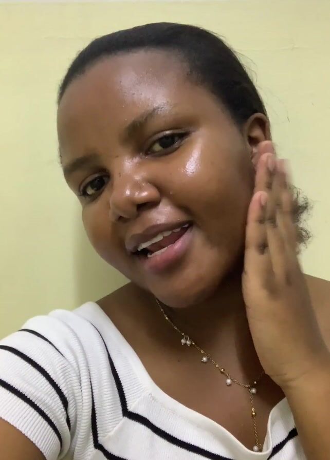 A young woman is in a close-up shot. She is wearing a white shirt with black stripes and a gold necklace with pearl accents. She has dark, pulled-back hair, smooth, shiny skin, and a bright smile. Her right hand is touching her right cheek. She says "I love you" and makes a kissy face. The background is a pale yellow wall.