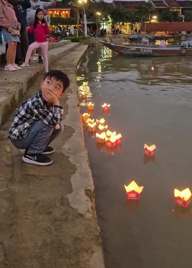 A young boy is crouching at the edge of a waterway, his hands supporting his chin as he gazes at floating paper lanterns. He is wearing a plaid shirt, jeans, and black sneakers. Behind him and to the left, a group of adults and a young girl are standing on the walkway. In the water, numerous small paper lanterns, each lit from within, are floating near the edge. Across the water, buildings with lights can be seen. A small boat with the text HA055 is visible further down the waterway. The sky is overcast, suggesting it is either dusk or dawn.