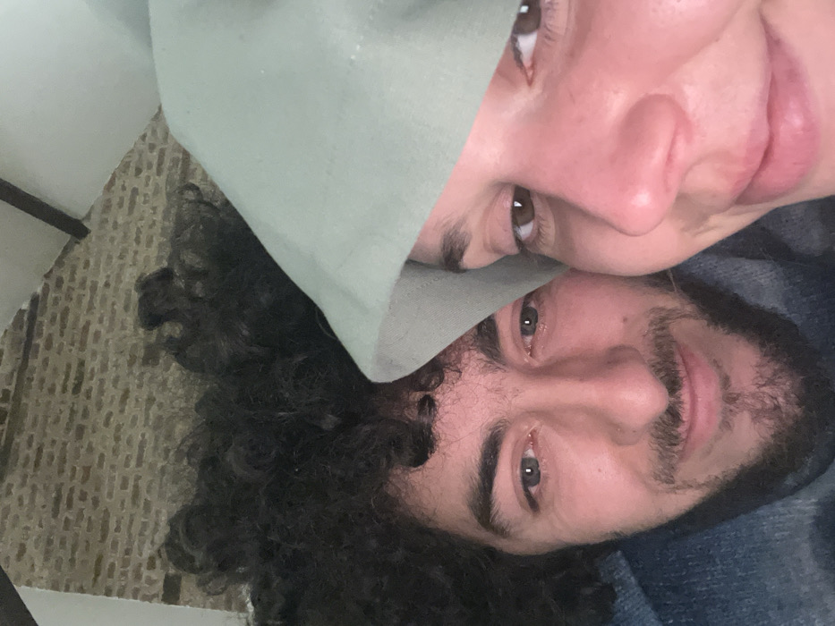 A rotated close-up captures two faces, one fair-skinned with a light green hood, and the other with curly black hair and a beard. Both faces exhibit a slight smile and directly face the camera. A textured beige surface appears in the background, likely a carpet. The lighting is soft, casting gentle shadows across the faces.