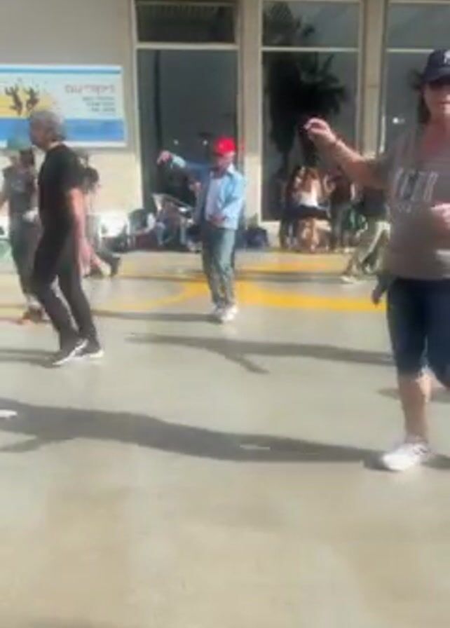 group of people dancing outside a building. There are approximately eight people visible, dressed in casual clothing. The dancers are performing a folk dance, moving in unison. One man in the center wears a red cap and light blue shirt. The building behind them has large windows and a sign written in Hebrew. The ground is concrete and there are yellow lines marking a dance area. Some people are seated and resting in the background. The lighting suggests it is daytime.