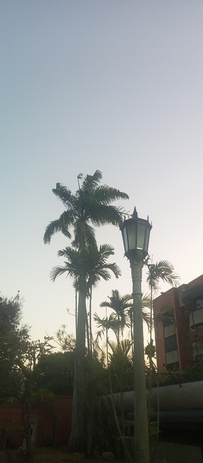 The image displays an outdoor scene during daylight, characterized by a clear sky transitioning from light blue at the top to a pale yellowish-white near the horizon, indicative of morning or late afternoon light. The prominent features include multiple palm trees and a street lamp. On the left, two tall, slender palm trees with green fronds extend towards the upper frame, accompanied by various shorter palm species and dense green foliage below. A reddish-brown wall is partially visible horizontally behind the lower vegetation on the far left. In the right-center, an unlit, classical-style street lamp stands vertically. It features a dark, multi-paned lantern head atop a greyish-green, fluted post. To the right of the street lamp, a segment of a multi-story building is visible, featuring a reddish-brown facade and dark windows. A large, dark, horizontal cylindrical structure is present at the base of this building. The ground level is covered with mixed green vegetation. No individuals, specific actions, or interactions are present. The urban environment, characterized by the specific palm species and architectural style, is consistent with locations within Caracas, Venezuela.