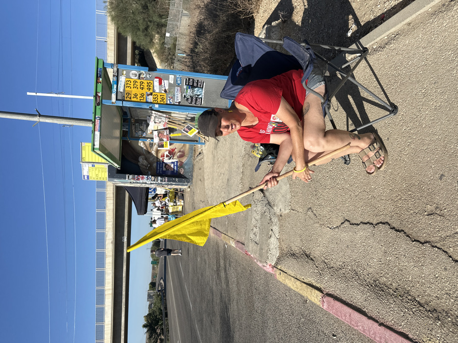 The image displays a roadside scene within the Shaar HaNegev Regional Council, Israel, under a concrete overpass on a clear, sunny day. In the foreground, a woman is seated on a dark blue collapsible camping chair on the paved road shoulder. She wears a red short-sleeved t-shirt with a graphic on the left chest, blue denim shorts, a dark baseball cap, tan open-toed sandals, and a yellow wristband on her right arm. She has a visible tattoo on her left thigh and another on her right arm. Her mouth is open, suggesting speech or a natural expression. She holds a wooden pole diagonally across her body, to which a bright yellow fabric flag is attached. Behind the woman and to her right is a metal bus stop shelter, featuring a green roof and blue sides extensively covered with various posters, stickers, and advertisements. A yellow sign displaying bus route numbers (e.g., 29, 373, 36, 379, 136, 495, 353, 361) is mounted above the bus stop. Adjacent to the bus stop, a black pop-up canopy is erected, under which several individuals and tables with various items are visible. Multiple yellow flags are positioned near this gathering area. To the left of the woman and the bus stop, an asphalt road extends into the distance, with a single male pedestrian, dressed in dark attire, walking away from the camera in the far lane. The paved road shoulder is bordered by a curb painted red and yellow. Above the road and the bus stop, a multi-lane concrete overpass with metal railings spans across the frame. The environment in the background consists of dry, light-colored soil and sparse, dry brush under a clear blue sky. A utility pole with power lines is also visible near the bus stop.