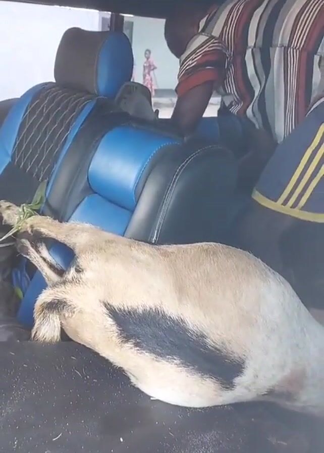 Inside a vehicle, a man in a striped shirt and shorts leans over the back seat. A goat lies still on the floor of the car, its head near the blue and black seat. The man picks up the goat's head and holds it up. The car interior has a patterned ceiling. A person can be seen through the rear window, standing outside.