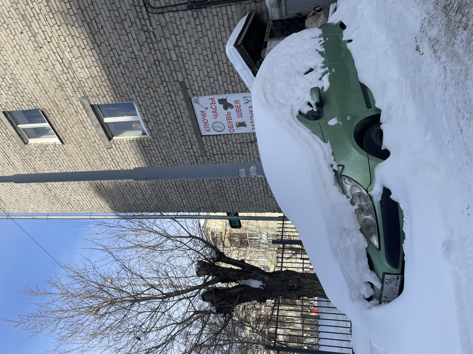 The image depicts a static urban scene in Yekaterinburg, Russia, during winter under a clear blue sky. A light green hatchback vehicle is prominently featured in the foreground, almost entirely buried under a thick, undisturbed layer of white snow. The front passenger side of the vehicle is visible, showing the headlight and a partially obscured Russian license plate "910H 96 RUS," with "96 RUS" indicating registration in Sverdlovsk Oblast. The ground around the car is also covered in deep snow. To the right, a light-colored brick building with two visible windows on the upper floors serves as a backdrop. A faint human figure or reflection is visible within the lower of these two windows. Below the lower window, a white rectangular sign is affixed to the brick wall, displaying Russian text and corresponding icons: "КЛЮЧИ" (Keys) with a key icon, "ЧАСЫ" (Watches) with a clock icon, "ОБУВЬ" (Shoes) with a shoe icon, "ШВЕЯ" (Seamstress/Tailor) with a spool of thread, and "ЗАТОЧКА" (Sharpening). Part of a snow-covered awning or entrance structure is visible to the far right. A tall, grey cylindrical pole, likely a streetlight or utility pole, stands vertically in the mid-ground, partially obscuring the brick building and the sign. To the left of the pole, a large deciduous tree with bare, heavily pruned branches stands behind a dark metal fence. In the distant background, another light-colored building is visible behind the tree and fence, and a faint green pedestrian traffic light with numerical display is visible to the left of the grey pole. No active human figures or animals are present in the immediate outdoor scene.