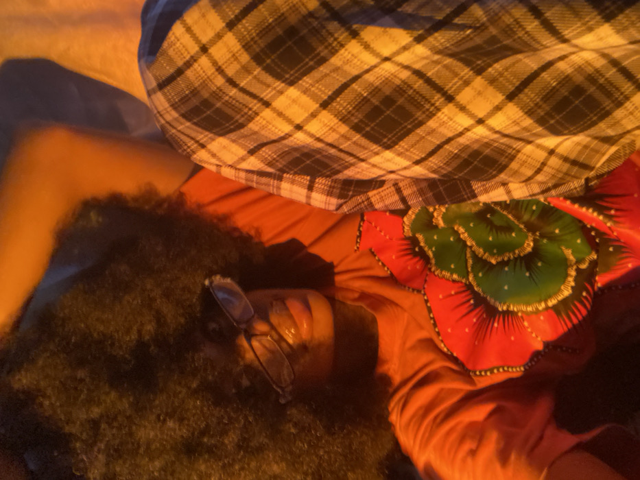 A person with an afro and glasses is lying down. A patterned blanket is near their head. They are wearing an orange shirt with a large, colorful flower design on the shoulder. The lighting is warm and creates strong shadows. The person's face is partially obscured by their hair and glasses. The image is taken from a slightly high angle.