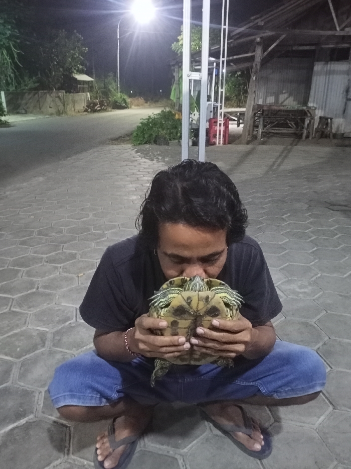 This image captures a night scene in Ketowan, Indonesia. An adult male with dark, wavy, shoulder-length hair, wearing a dark short-sleeved t-shirt, blue denim shorts, and dark flip-flops, is crouched on a grey hexagonal paver surface. He has an earring in his left ear and a braided bracelet on his left wrist. The man is holding a freshwater turtle, identifiable by its green and yellow striped carapace and patterned plastron, directly to his face. His eyes are closed, and his lips are pressed against the turtle's head, indicating an intimate interaction. The background reveals a paved road curving to the left, illuminated by a bright street light mounted on a tall pole, which causes significant lens flare. Sparse vegetation and a small, dimly visible building are on the far left side of the road. To the right, an open-sided structure with a corrugated metal roof and visible wooden support beams contains multiple wooden tables and benches. Red beverage crates are stacked near the entrance of this structure. Shadows are cast across the paver ground, indicating artificial light sources.