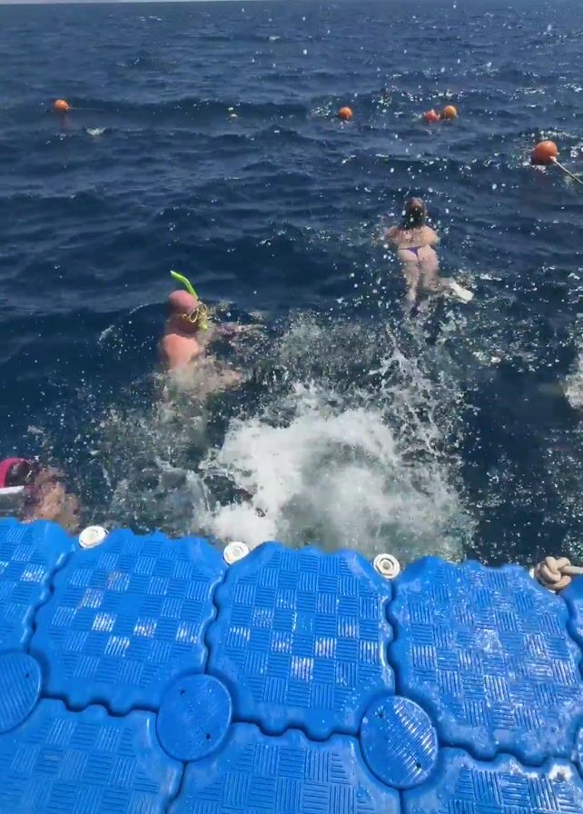 The scene depicts a group of four people snorkeling in a blue ocean. They are equipped with snorkels and masks, and are swimming in relatively clear water. They appear to be swimming near a blue floating platform consisting of interlocking blue plastic blocks. One man is climbing onto the platform. Orange buoys are scattered across the surface of the water. In the distance, a land mass, possibly an island or coastline, is visible under a sunny, blue sky with scattered clouds.