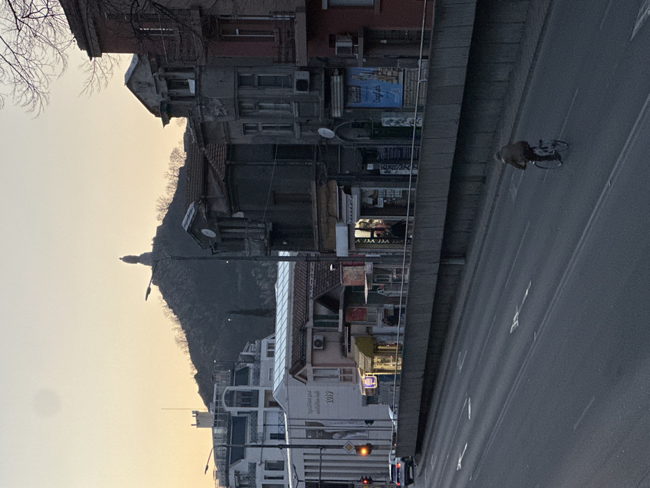 An elevated long shot captures a twilight urban scene in Plovdiv, Bulgaria, oriented towards Bunardzhik Hill with the Alyosha monument silhouetted on its peak. The sky transitions from a pale orange horizon to a lighter yellow above. In the background, Bunardzhik Hill dominates, a dark, rocky mass sparsely covered with bare trees. The "Alyosha" monument, a large, upright figure, is distinctly silhouetted against the sky at the hill's summit. The midground features a dense row of buildings situated above a concrete retaining wall or overpass. On the left, a large, multi-story white building, likely a modern commercial or public facility, bears partial text "EXPOSITION HALL" and "2019". To its right, a series of older, mixed-use buildings display varied architectural styles, some with weathered facades, balconies, and air conditioning units. The ground levels of these buildings house several small businesses or kiosks, some illuminated with bright interior lights. Visible signage includes Cyrillic text and a poster with the word "English". Several indistinct human figures are visible on the sidewalk in front of these shops, one near a brightly lit storefront. In the foreground, a multi-lane asphalt road, likely Tsar Boris III Obedinitel Boulevard, spans horizontally. White directional arrows indicating straight and left turns are painted on the road surface. A single individual on a bicycle, wearing a light brown jacket, traverses the rightmost lane, moving away from the viewer. In the far-left lane, a white sedan is stationary with illuminated red brake lights, positioned near a traffic light showing a yellow signal. Bare tree branches are visible on the far right of the frame.