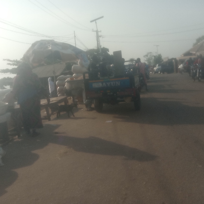 A hazy street scene with vendors and vehicles. A person stands near a table with bags of goods beneath a makeshift shelter. A small black dog stands next to the table. A blue truck loaded with items is parked on the street. Further down the road, motorcycles and other vehicles are visible with people riding them. Utility poles and wires stretch across the sky. The overall lighting suggests it is early morning or late afternoon.