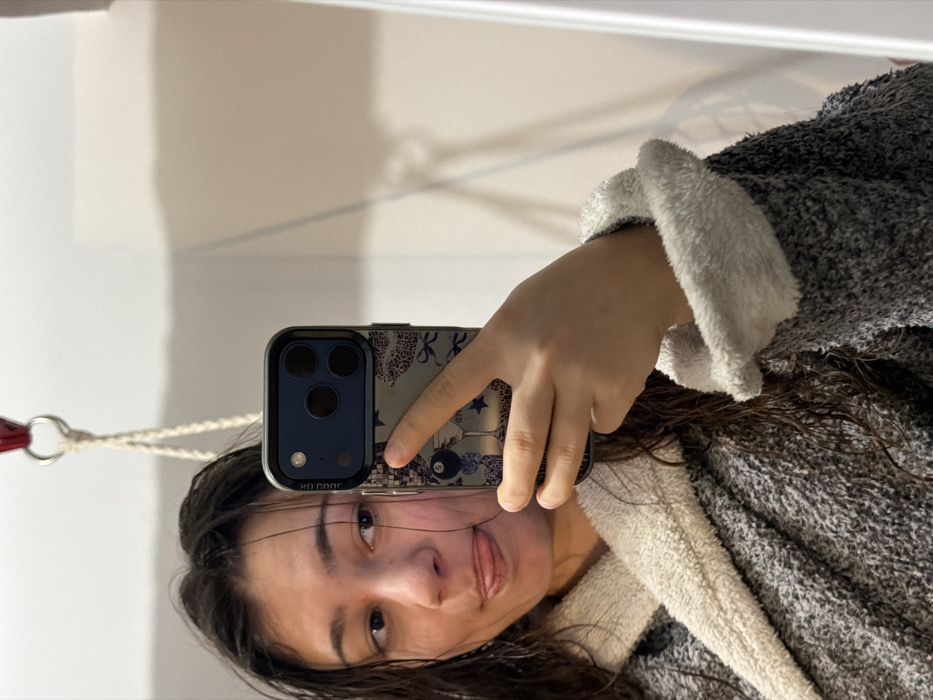 A woman with wet, dark hair is taking a selfie in a mirror. She wears a gray and white fluffy robe. Her right hand holds an iPhone with a patterned case featuring celestial and other designs. The phone's three-lens camera is visible. A hanging object with a rope and red accent is slightly visible in the background. The room has a plain, light-colored wall.