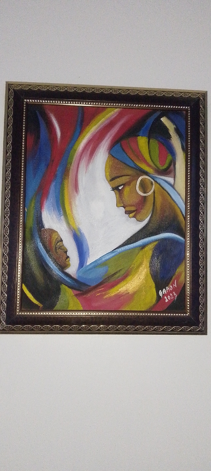 An oil painting of a dark-skinned woman gazing down at a baby. The woman wears a colorful headwrap and a large hoop earring. The baby is wrapped in cloth, with only the head visible. Swirls of blue, red, yellow, and white paint form a backdrop around the figures. The painting is signed "AARON 2023" and displayed in an ornate, dark brown frame with a beaded inner border. The painting hangs against a white wall.