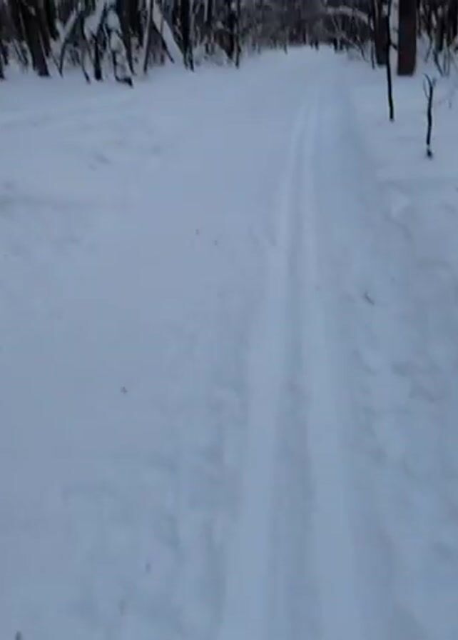 first-person perspective of someone cross-country skiing on a snowy trail through a forest. The skier is moving forward, and the snow-covered trees are visible on either side of the trail. The sky is visible through the bare branches of the trees. The snow appears fresh and undisturbed, with ski tracks clearly visible.