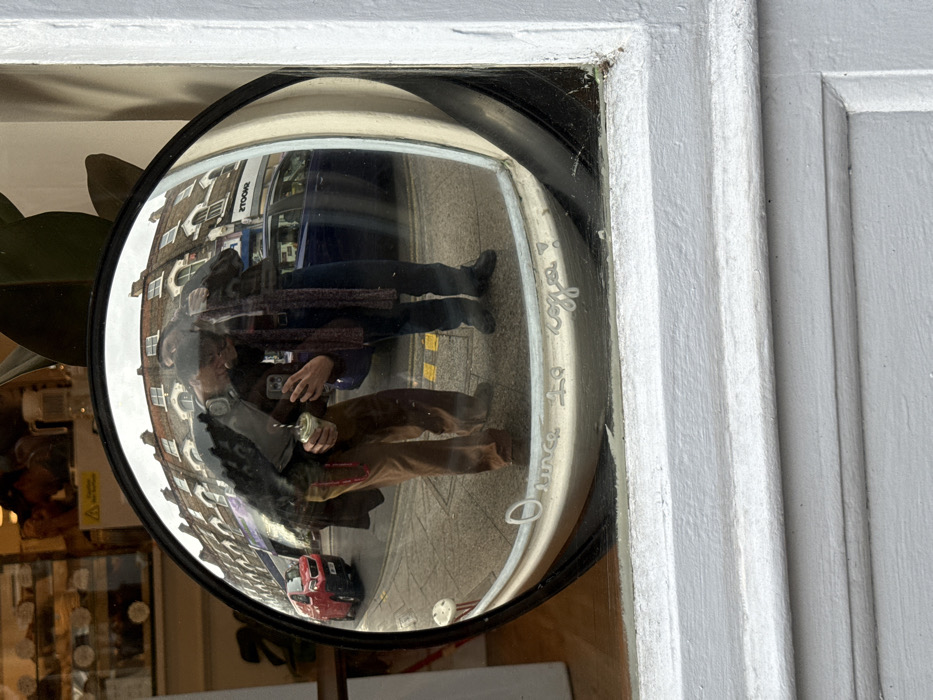 - "A convex security mirror, housed within a white-painted window frame, captures a reflection of two individuals and a London street scene" by FM-jCIl63, licensed under CC BY 4.0