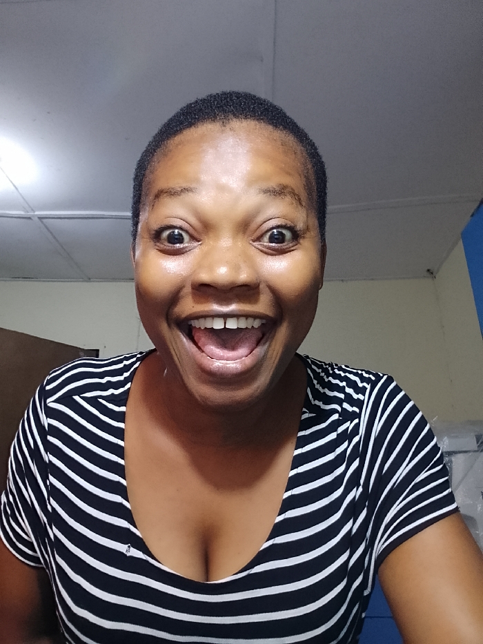 A smiling woman with close-cropped dark hair and wide eyes looks directly at the camera with an expression of surprise and delight