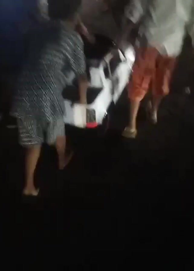 The video depicts a group of people moving a small, white, toy-sized pickup truck at night. Three people are directly involved in moving the truck, while others are nearby. One person is wearing a short-sleeved, patterned shirt, another is wearing a white shirt and orange capri pants, and a child in a blue shirt also helps move the truck. The scene is dimly lit, and the ground appears to be dark asphalt. There are some chairs and other objects visible in the background. The people are pushing and guiding the truck, presumably from one location to another.