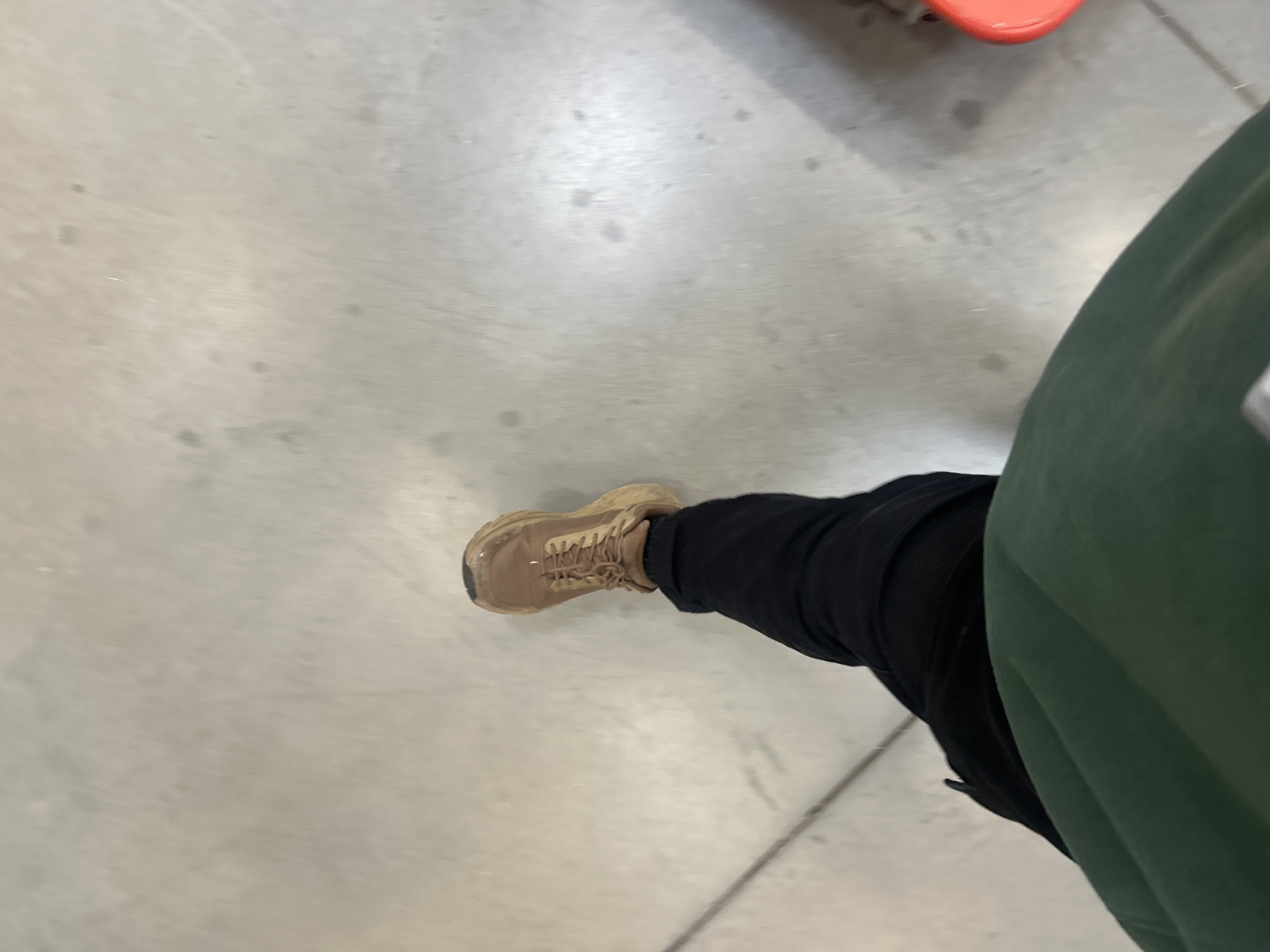 The image depicts a person's perspective looking down at their left foot wearing a tan hiking boot with black pants. A green object, possibly a shopping cart or bag, is partially visible to the right. The ground is a light grey concrete surface. There is no indication of location.