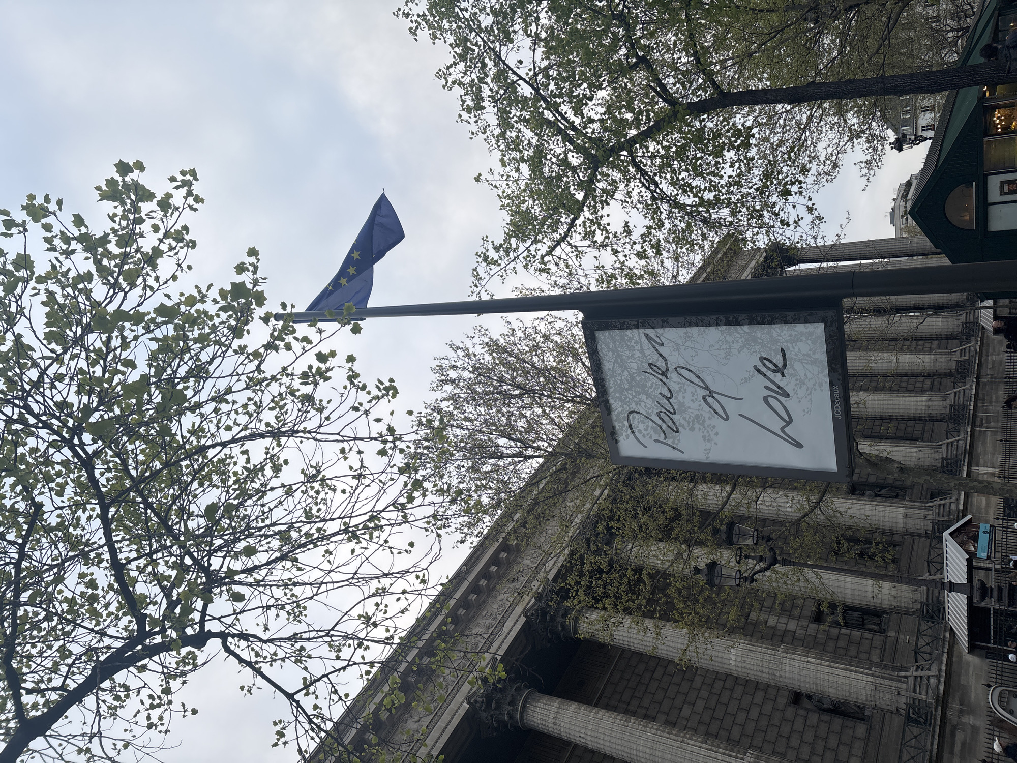 The image depicts an outdoor scene in Paris, France, focused on the Place de la Madeleine, with the classical façade of L'église de la Madeleine prominent on the left. In the foreground, a tall, dark vertical pole supports a large, illuminated advertising panel that displays the phrase "Power of Love" in cursive white script against a light background. The name "JCDecaux" is visible at the bottom of the panel. Above this panel, attached to the same pole, is a blue flag with a circle of yellow stars, representing the European Union, flying under an overcast sky. Numerous trees with visible branches and fresh green leaves, indicative of spring foliage, frame the upper and right portions of the sky. To the left, the stone-built Madeleine Church features a grand portico with large Corinthian columns and an elaborately carved frieze. Below the columns, at street level, a traditional black street lamp with multiple lanterns stands. At the base of the church and on the sidewalk, several indistinct individuals are visible, suggesting pedestrian activity. To the lower right, a small green-roofed kiosk or stall is partially visible, consistent with vendors typically found in the area. The overall lighting suggests a cloudy daytime environment.
