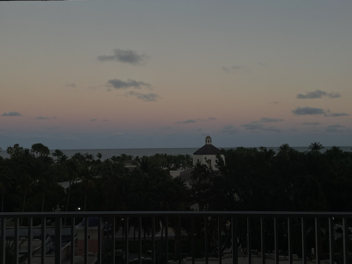 A tranquil dusk view from a balcony. A metal railing is in the foreground. Beyond, a dense layer of trees stretches to the horizon. A domed building is nestled among the trees. The sea is a faint line separating the trees from the sky. The sky transitions from a dusky purple at the horizon to a light gray at the top, dotted with scattered clouds.